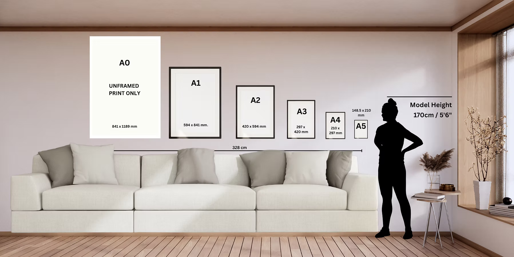 Our larger artworks (A2, A1, and A0) are printed on smooth 140gsm matte paper with a clean, non-reflective finish.